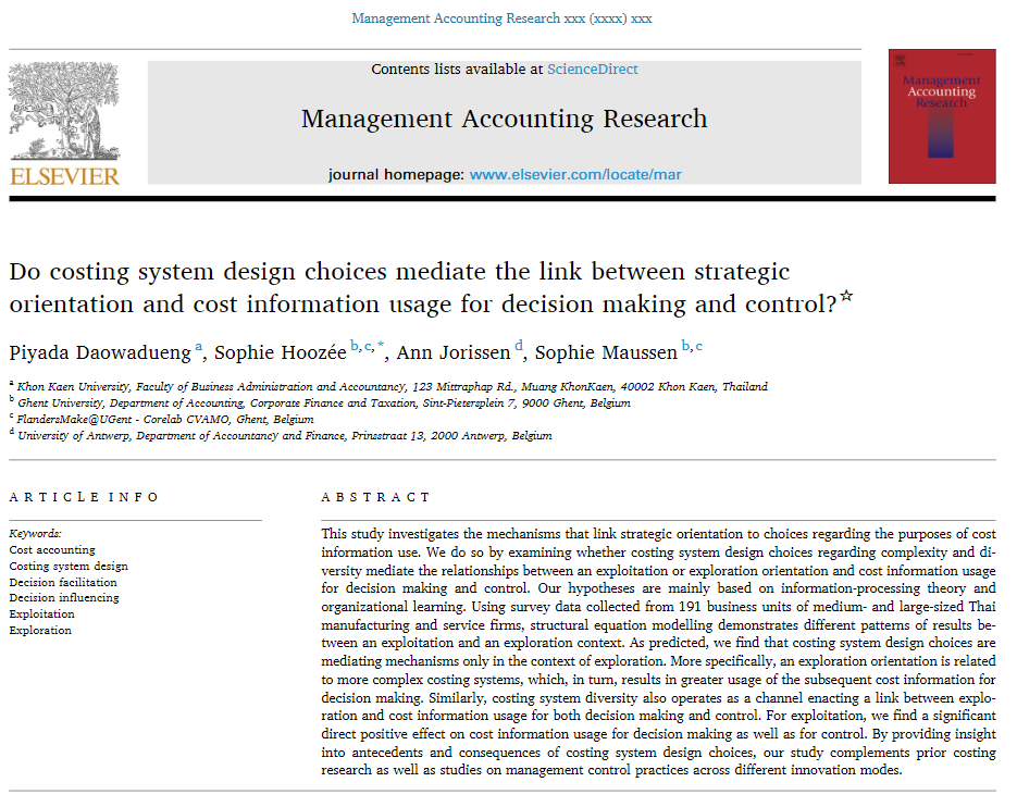 Reference: Daowadueng, P., Hoozée, S., Jorissen, A., & Maussen, S. Forthcoming. Do costing system design choices mediate the link between strategic orientation and cost information usage for decision making and control? Management Accounting Research: 100854.