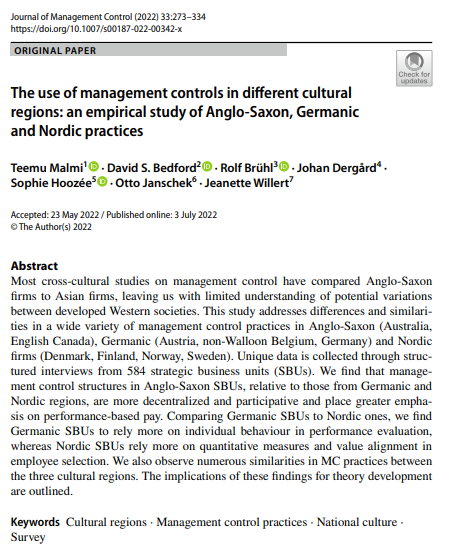 Reference: Malmi, T., Bedford, D.S., Brühl, R., Dergård, J., Hoozée, S., Janschek, O., Willert, J., forthcoming. The use of management controls in different cultural regions: an empirical study of Anglo-Saxon, Germanic and Nordic practices. Journal of Management Control.