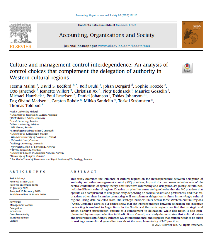 Reference: Malmi, T., Bedford, D.S., Brühl, R., Dergård, J., Hoozée, S., Janschek, O., Willert, J., Ax, C., Bednarek, P., Gosselin, M., Hanzlick, M., Israelsen, P., Johanson, D., Johanson, T., Madsen, D.Ø., Rohde, C., Sandelin, M., Strömsten, T., Toldbod, T., forthcoming. Culture and management control interdependence: an analysis of control choices that complement delegation of authority in Western cultural regions. Accounting, Organizations and Society.