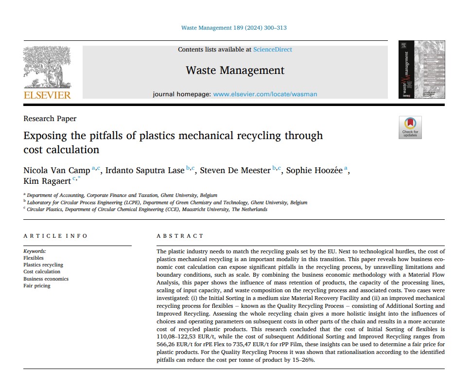Full reference: Van Camp, N., Lase, I.S., De Meester, S., Hoozée, S. & Ragaert, K. 2024. Exposing the pitfalls of plastics mechanical recycling through cost calculation. Waste Management.