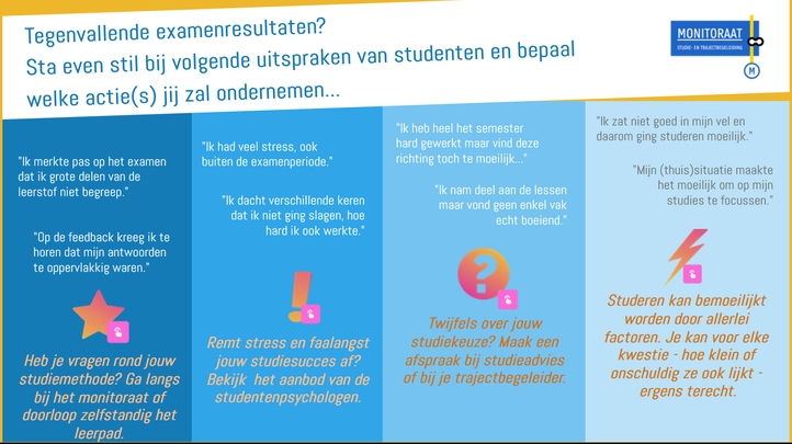 Hieronder vind je een aantal acties voor studenten 1ste bachelor. Deze acties kunnen je helpen om weloverwogen beslissingen te nemen ter voorbereiding van de tweede zittijd. Jouw monitoraat helpt je hier graag bij.