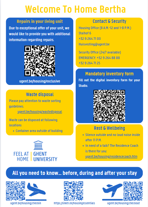 Check-in for all Homes (Fabiola, Vermeylen, Heymans, Astrid, Boudewijn, Bertha (De Vriese), Groningen, Uppsala, Göttingen, Canterbury (Kantienberg) can be done at our reception desk.