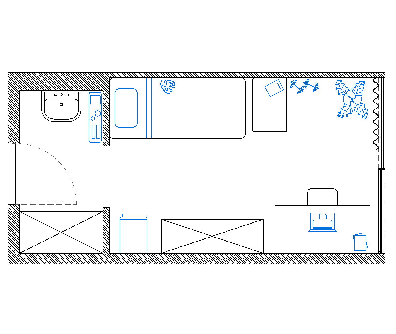 Hereunder the typical floor plan of a room in Home Vermeylen. Rooms are mirrored relative to each other, and thus small differences are possible.