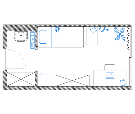 - Standard furniture included (bed, mattress, cupboard, desk, chair)