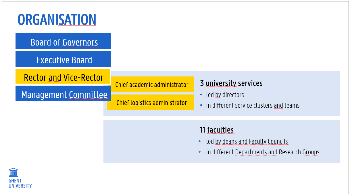 The daily governance of Ghent University consists of the rector, vice-rector and administrators. Together with the Board of Governors and the Executive Board, they form the management of Ghent University. The management is supported by 3 university services.
