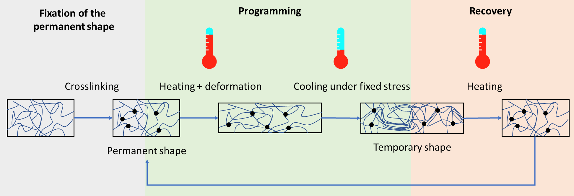 - The general concept is that the shape of shape-memory polymers can change after a stimulus such as temperature, pH, etc. In this project, shape-memory polymers are activated at 37°C (body temperature) to adjust their form to the defect tissue to be replaced.