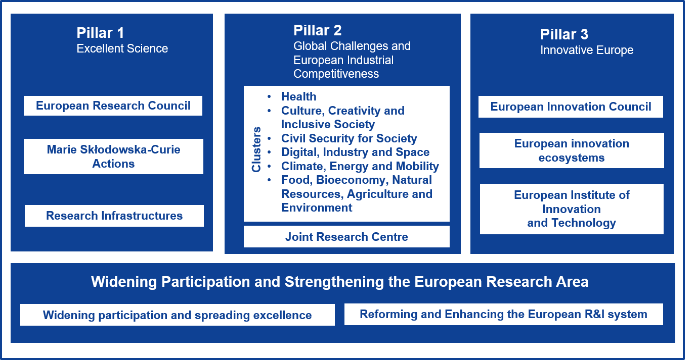 The funding programma Horizon Europe consists of 3 pillars and 2 cross cutting pillars: