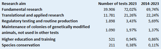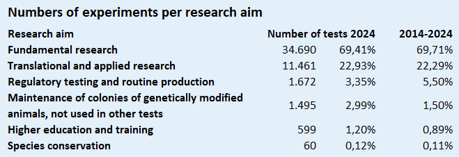 Research with most other animal species, in contrast, is aimed at acquiring knowledge about the welfare of the animals. This is true, for example, for all experiments conducted using cattle, horses or cats in the context of research during the period 2014-2024. In the case of dogs this is true for 99.64% of experiments conducted over the same period; since 2019 this is 100%.