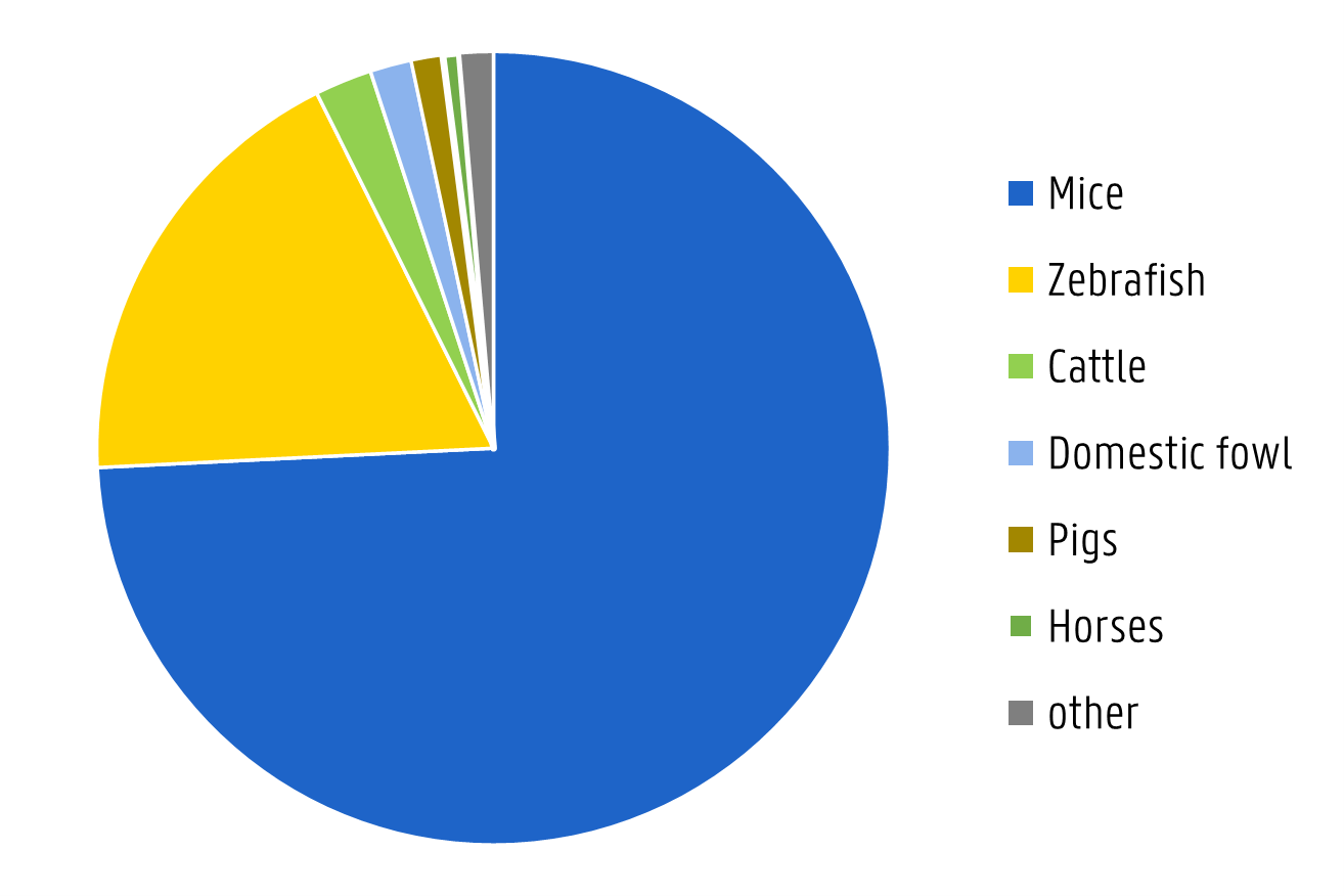 In many cases, animal research is conducted with an eye to direct or indirect application for human health. In 2024, for example, this was true of more than 98% of experiments using mice. The primary aim of research using rats and zebrafish is also to expand knowledge about humans and human health (resp. 99 and 100%).