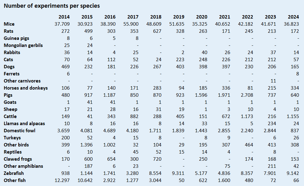 The number of experiments with dogs, all in the context of veterinary medicine, was lower in 2024 than in all previous years. In cats, the number of experiments, also in the context of veterinary medicine, is about a quarter of the numbers of the past five years.