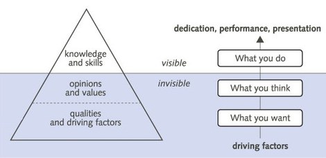 Below the water surface there are four layers that are often unspoken, invisible and unconsciously present. These are our beliefs, values, qualities and drivers. They represent what you are thinking about yourself, others and your role and want you want for yourself and others, what is important to you. These factors (such as norms and values) can influence our visible behavior and knowledge: they can either work reinforcing or obstructing. Especially when your behavior is not compatible with what you believe in or what you value, you may feel frustrated or inadequate in your role.