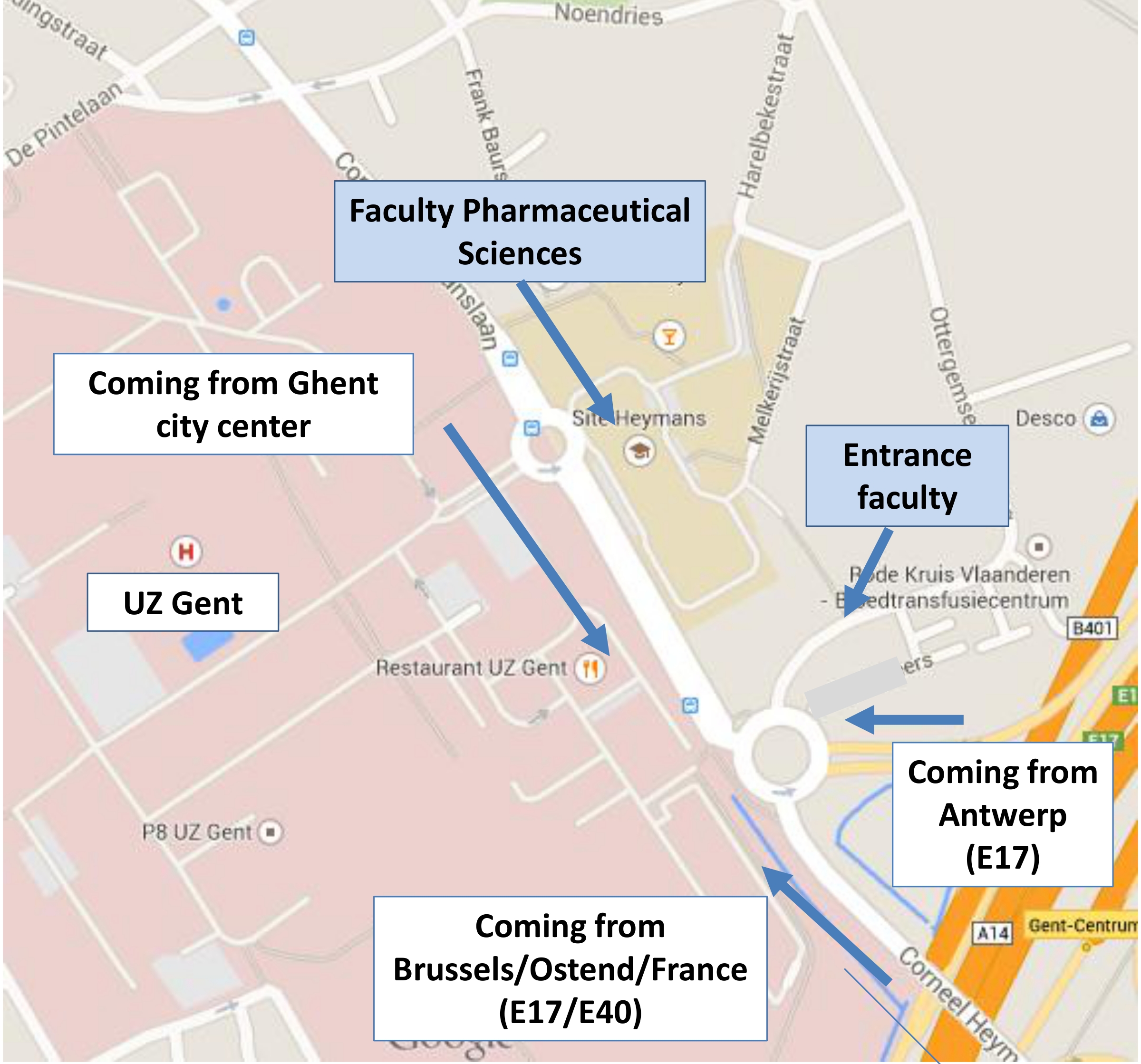 Car: Coming from Brussels/Ostend/France (E40 or E17): follow the E17 direction Antwerp, take exit "UZ Gent", turn right, drive across the bridge, take the second exit at the roundabout (Ottergemsesteenweg). The entrance of the Faculty of Pharmaceutical Sciences is the first street on the left.