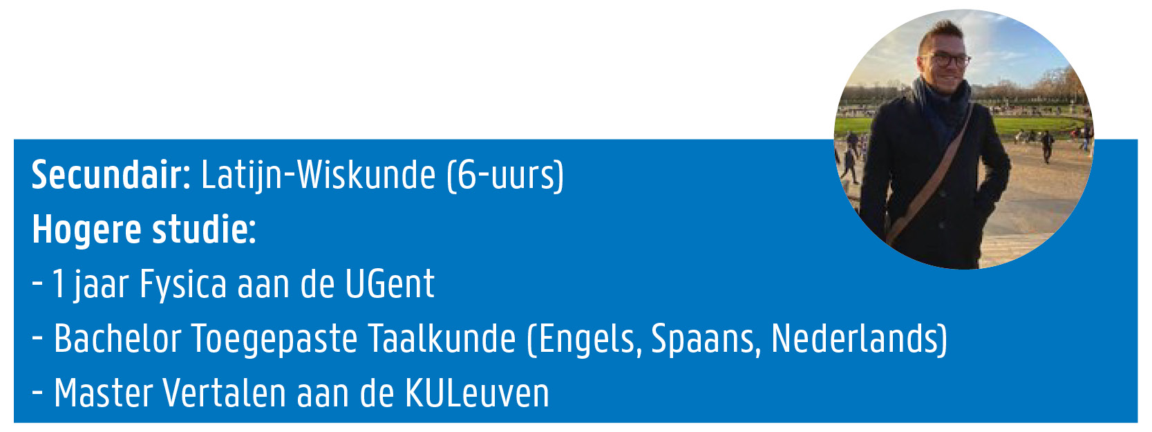 De opleiding Toegepaste Taalkunde en de Master Vertalen daarna hebben me als persoon zeker mee gevormd en veranderd. Zo ben ik alleszins communicatiever geworden: voor groepen spreken, of zelfs gewoon één op één, waren dingen die ik in mijn eerste jaar Fysica weinig of niet deed. Door mijn buitenlandverblijf ben ik ook veel vlotter geworden, niet alleen in mijn moedertaal maar daarnaast dus ook nog in mijn twee vreemde talen. Het is zeker een troef van onze opleiding dat iedereen de kans krijgt om in het buitenland te gaan studeren. Door de algemene vakken binnen de opleiding heb ik ook een open kijk gekregen en heb ik kennis over verschillende onderwerpen, een grote troef voor iedereen die professioneel met taal bezig wil zijn. Zoals zoveel studenten zullen zeggen ben ik daarnaast uiteraard ook wat volwassener en veel zelfstandiger geworden tijdens mijn jaren aan de universiteit.