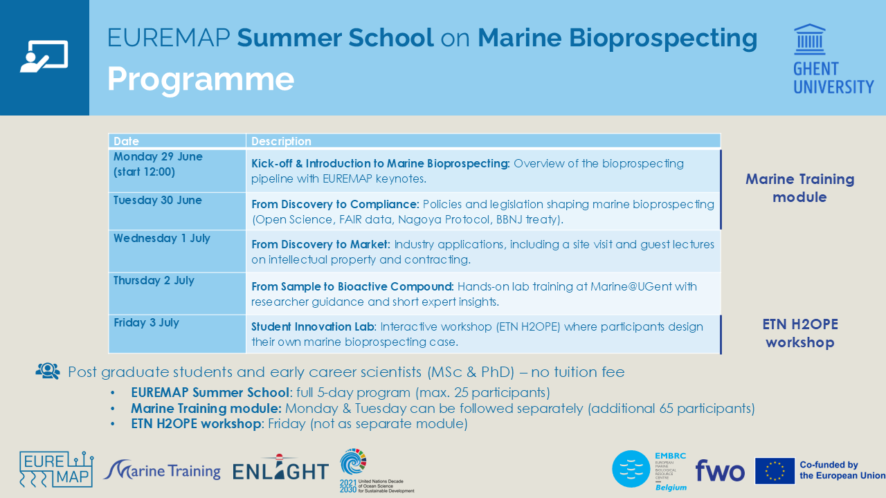 The Summer School on Marine Bioprospecting is organized by Marine@UGent within the EUREMAP project, with additional support from MarineTraining.eu, ENLIGHT European University and the ETN H2OPE network to accommodate wider participation. Furthermore, it is recognized as an initiative under the UN Ocean Decade.