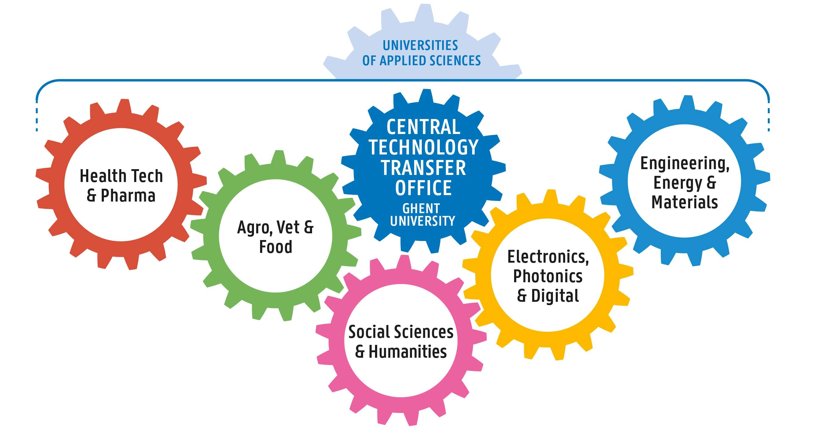 Each cluster is coordinated by a business developer and form together with the central Technology Transfer Office a large unit of about 50 people responsible for valorisation activities at Ghent University. The overall goal is to create societal impact through transfer or exchange of knowledge and technology.