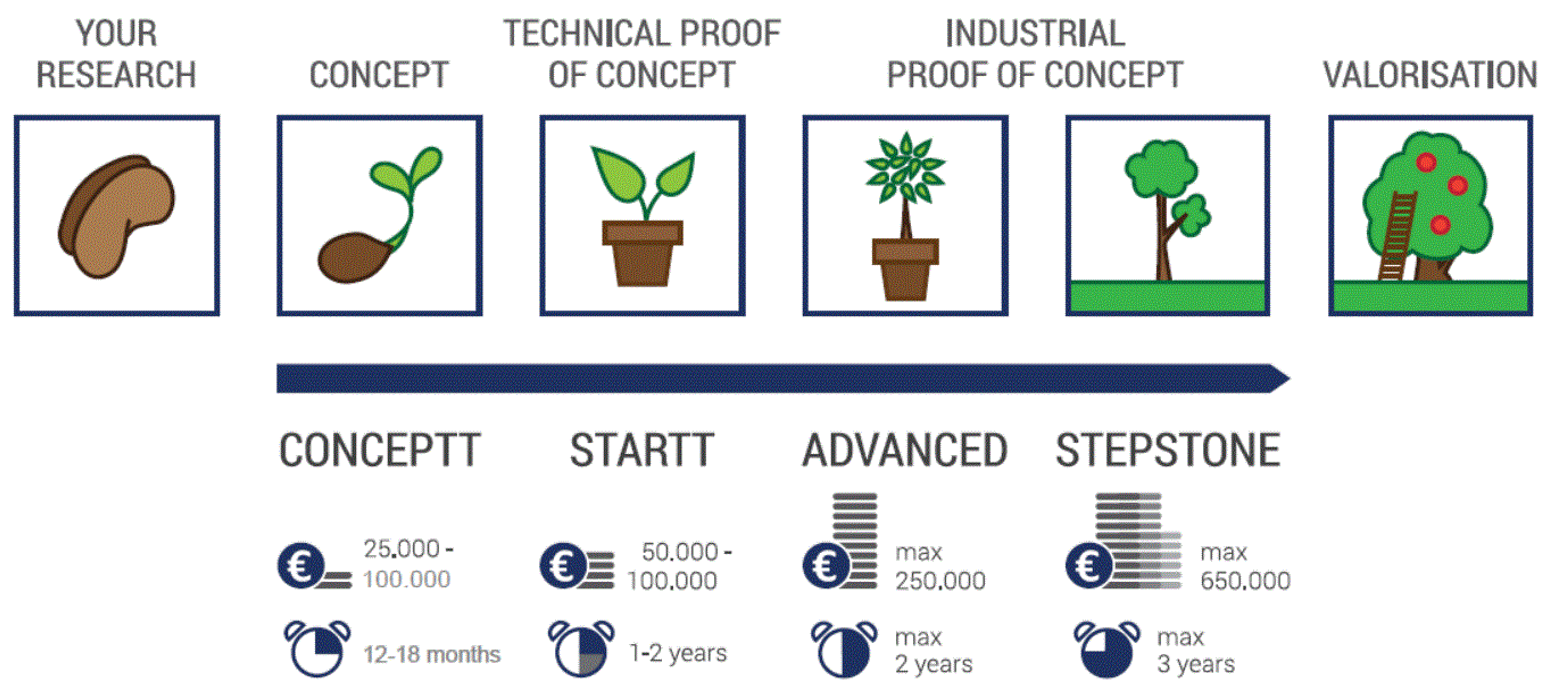 The NB-photonics consortium has internal strategic roadmaps for selected photonic technologies. With funding from the Flemish industrial research fund (IOF) we will mature and de-risk these technologies further. Below the different IOF funding possibilities are shown.