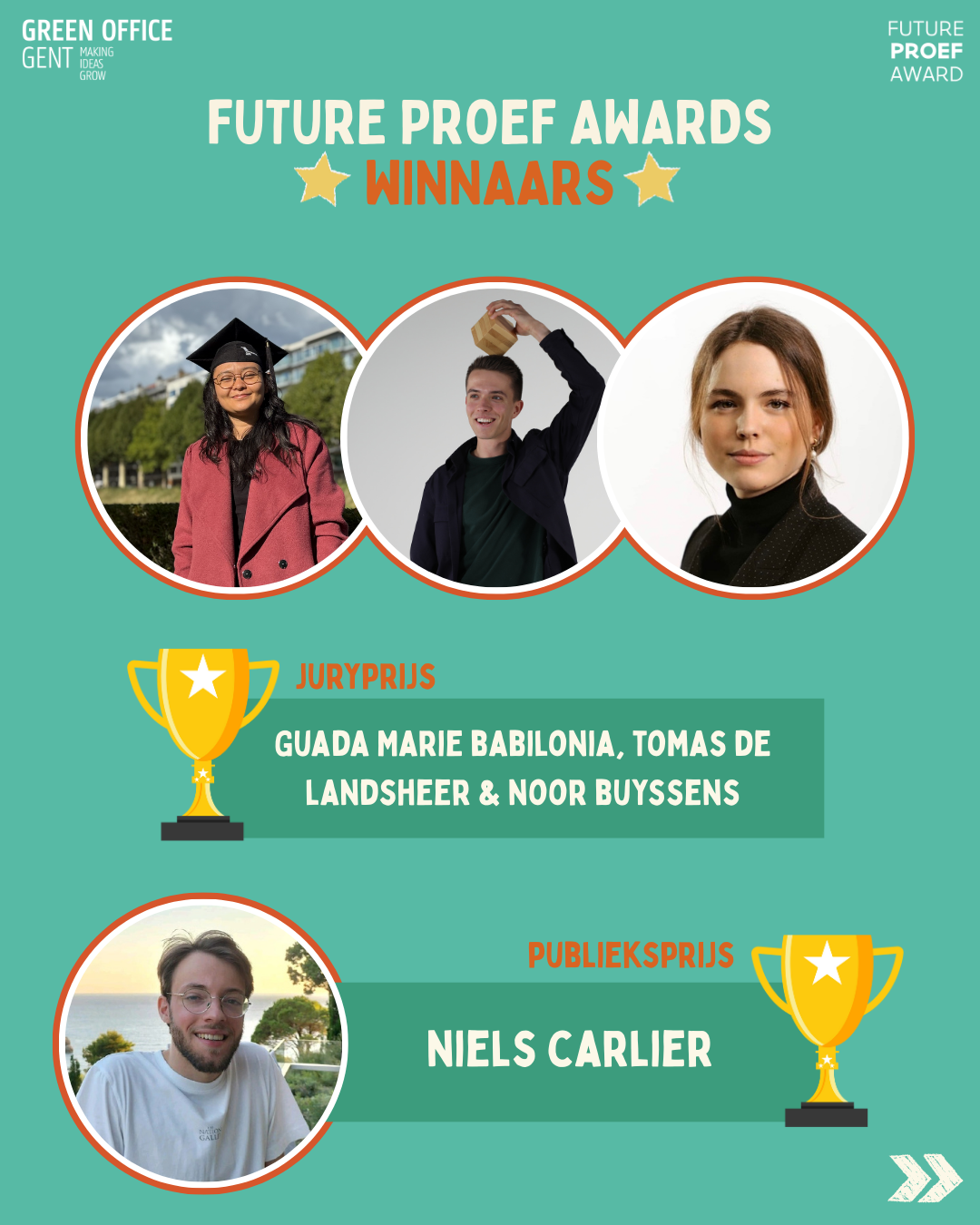 Uit de tien genomineerden koos de jury gisterenavond drie winnaars. Zij mogen op hun beurt de UGent vertegenwoordigen op de Vlaamse Future Proef Awards. Daar maken ze kans op een scriptieprijs van 3000 euro!