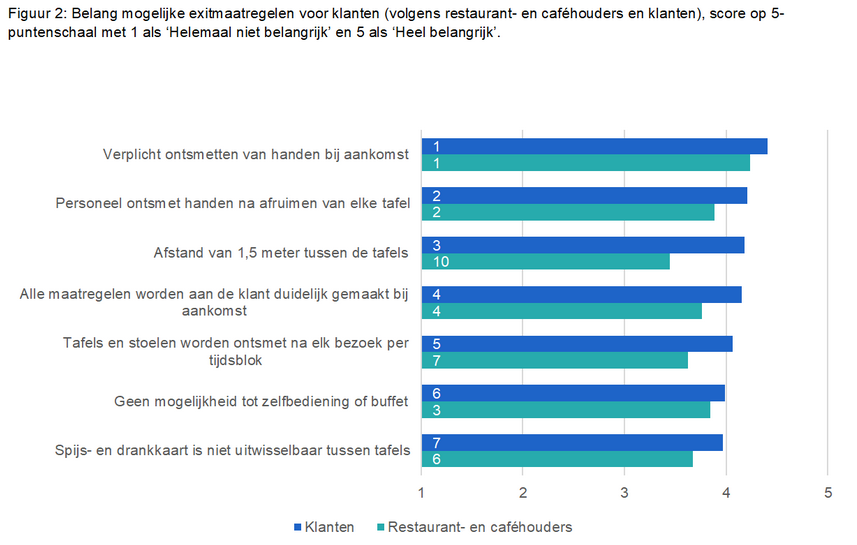 Om hun terugkeer veilig te laten verlopen, verwachten klanten dat de horeca inspanningen levert door maatregelen in te voeren. Het is opvallend dat restaurant- en caféhouders het belang dat hun klanten hechten aan de maatregelen systematisch lager scoren dan de klanten zelf. Dat is voornamelijk het geval voor de 1,5 meter afstandsmaatregel en het plaatsen van plexiwanden tussen de tafels.