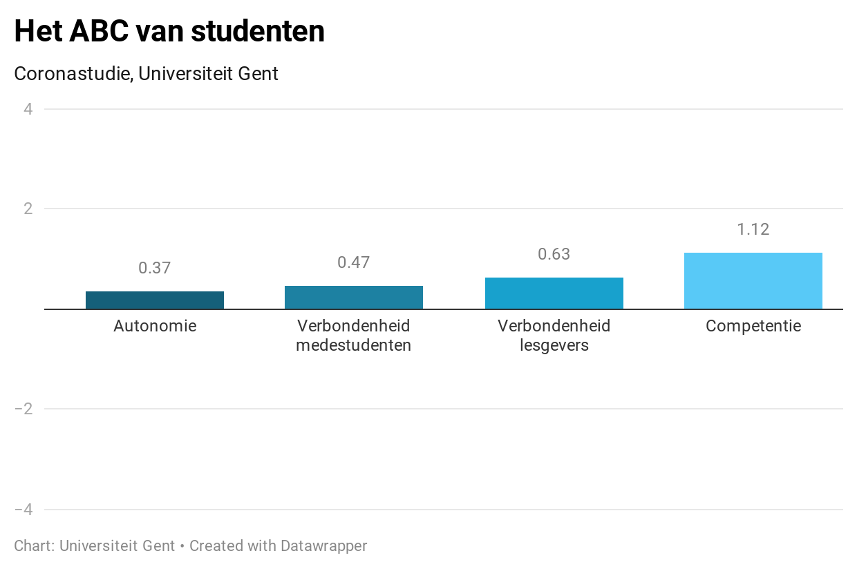 Deze drie behoeftes kan je makkelijk onthouden met ABC, waarbij de A staat voor Autonomie, de B voor verBondenheid en de C voor Competentie. Dit ABC van de student is belangrijk, omdat veelvuldig onderzoek heeft aangetoond dat studenten van wie het ABC is voldaan zich beter in hun vel voelen en zich meer inzetten voor hun studies. Ook uit de resultaten van deze studie blijkt dat behoeftebevrediging de motor vormt voor mentale gezondheid en veerkracht van studenten. Studenten met lage ABC-scores rapporteren meer depressieve en angstige klachten en ervaren deze coronacrisis meer als een obstakel om het academiejaar tot een goed einde te brengen. Bovendien vertonen deze studenten meer faalangst en uitstelgedrag en zijn ze minder gemotiveerd om zich in te zetten voor hun studies.