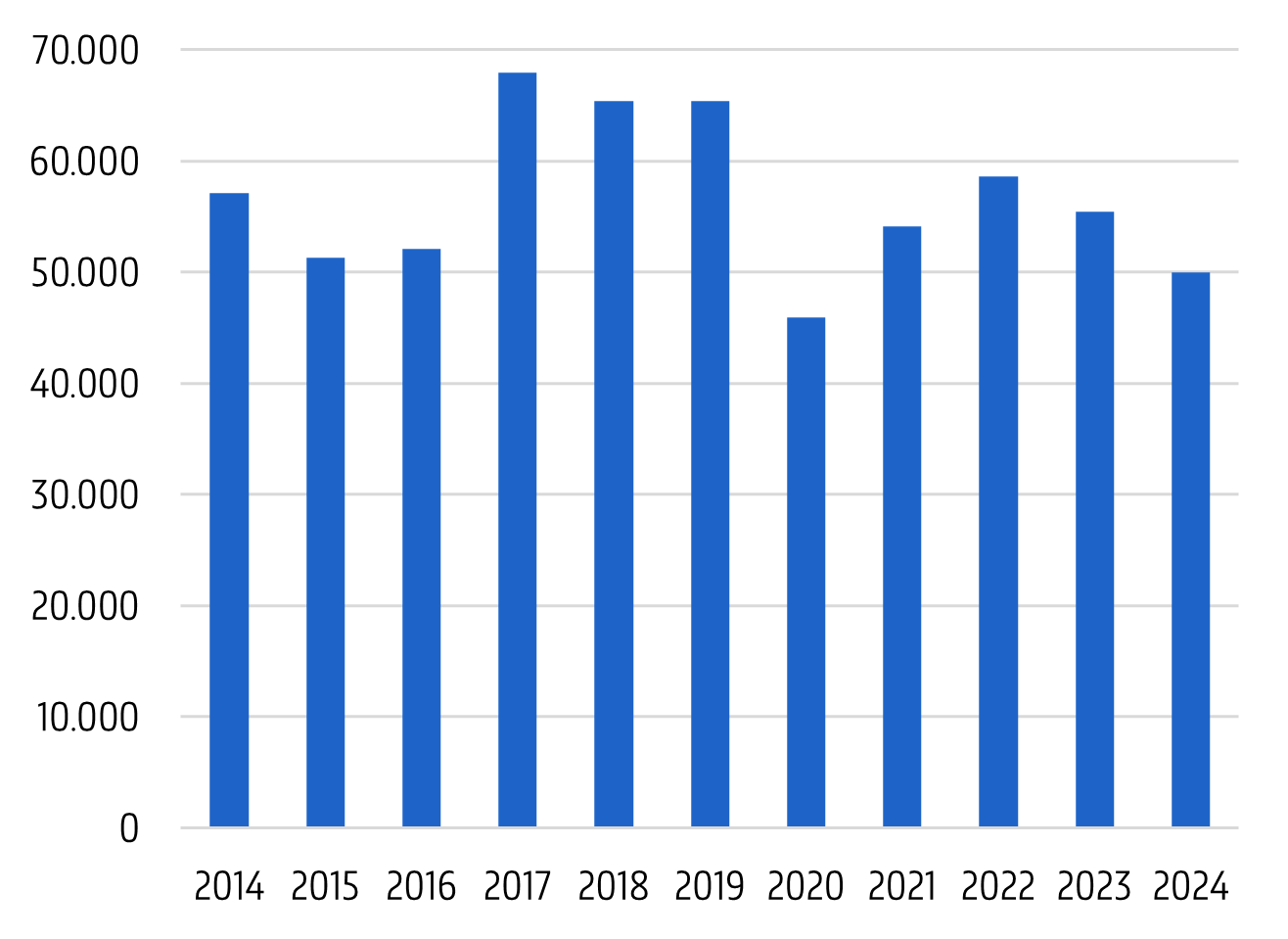 De grafiek toont de cijfers vanaf 2014. Het aantal proeven in 2024 is het op één na laagste uit de periode 2014-2024 (na 2020, wanneer de cijfers beïnvloed werden door de Covid-19 pandemie). Het aantal dieren dat hergebruikt werd, lag nabij het gemiddelde van de voorgaande jaren (362 versus 165 tot 630 in de periode 2014-2023).