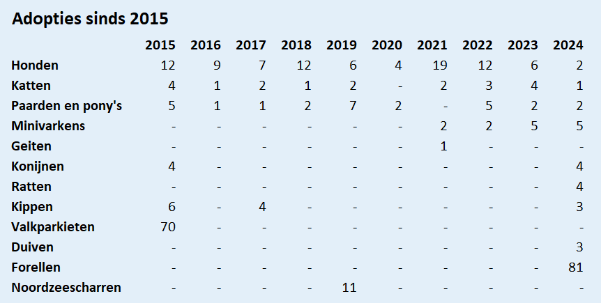In 2015 werd een succesvol adoptieprogramma opgestart door de Faculteit Diergeneeskunde. De onderstaande tabel toont de geadopteerde dieren tot 2024.
