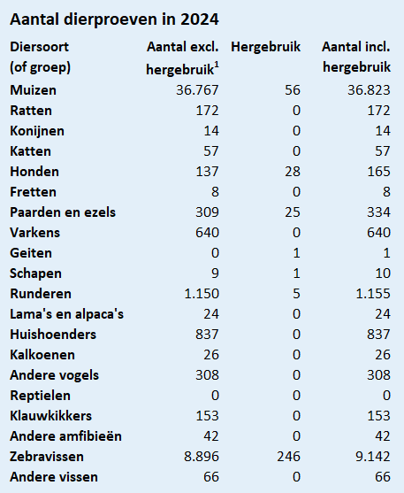 1 Hergebruik slaat op het aantal dieren dat reeds in een eerdere proef gebruikt werd. Er zijn strenge regels waaraan hergebruik dient te voldoen (cf. ernstgraden, zie welzijn bij proefdieren).