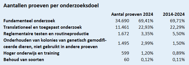 Proeven met de meeste andere diersoorten zijn daarentegen gericht op de kennis rond of het welzijn van die dieren. Dit geldt bijvoorbeeld voor alle proeven met runderen, paarden of katten in onderzoekscontext in de periode 2014-2024. In het geval van honden gaat dit over 99,64% van de proeven in dezelfde periode; sinds 2019 is dit 100%.