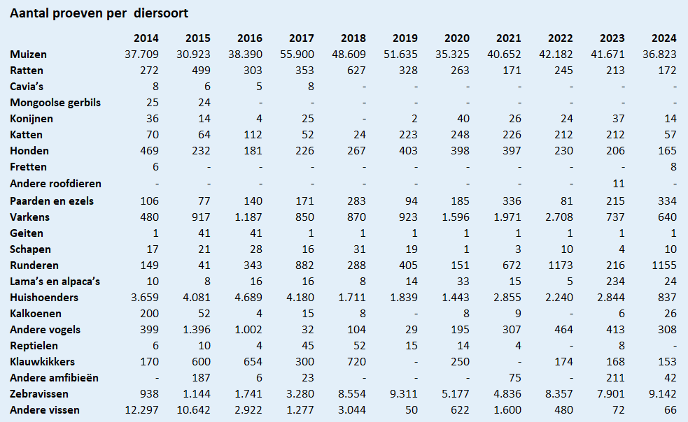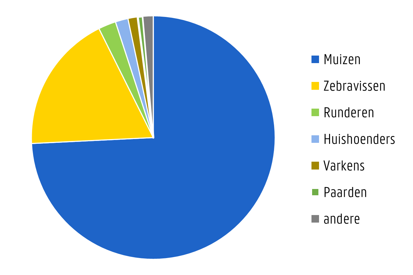 Het aantal proeven met zebravissen in 2024 is hoger dan in elk van de voorgaande jaren. Dit is het enige cijfer waarbij er een duidelijk stijgende trend is. Het aantal proeven met muizen is dan weer het laagste sinds 2017 (met uitzondering van 2020, het jaar van de Covid-19 pandemie). Het aantal proeven met ratten vertoont een dalende trend over de laatste tien jaar. Procentueel blijft het aantal proeven met muizen relatief ongewijzigd zo’n 75% van de dierproeven verklaren. De UGent doet geen proeven met apen.