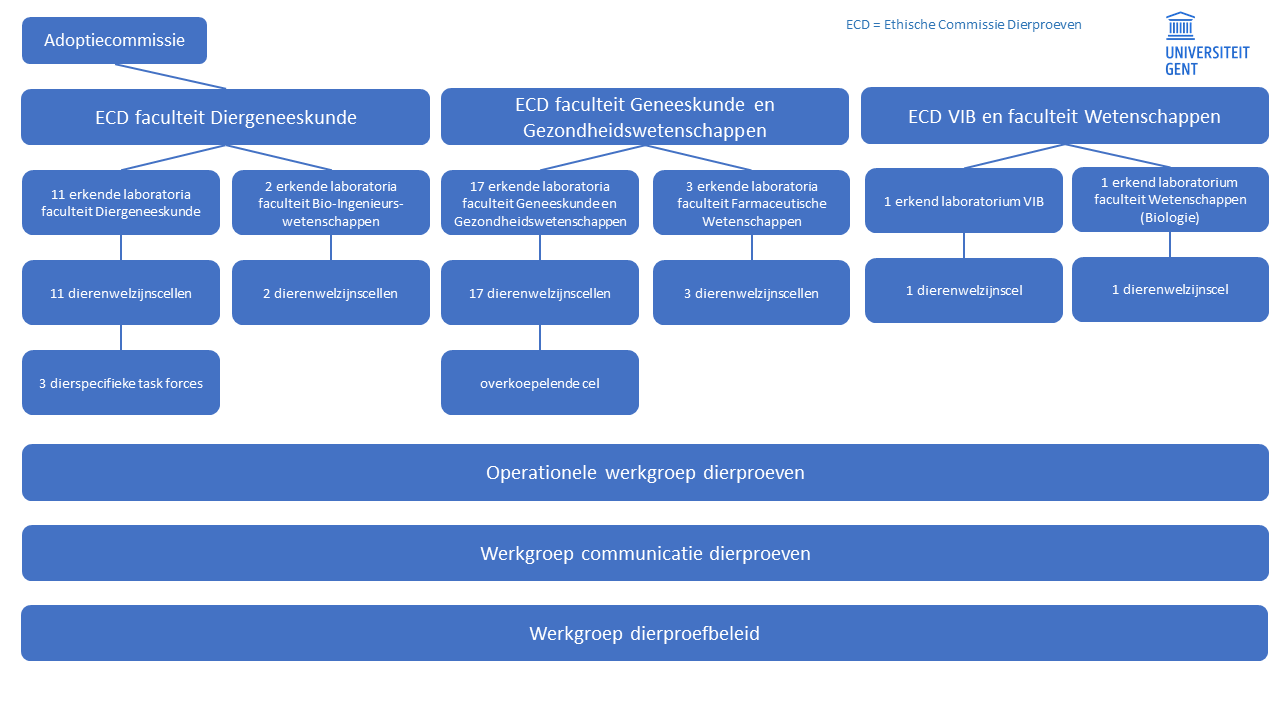 Onderstaande figuur toont de structuren aan de UGent die zich betrokken zijn bij dierproeven.