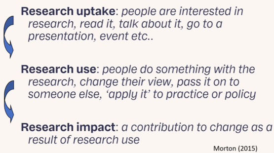 Hoewel onderzoekers hun rol in het proces vervullen door het plannen van valorisatie (bijv. aan de hand van zogenaamde impacttrajecten of pathways to impact), is er ook een grote rol weggelegd voor andere stakeholders. Een proces van 'uptake' (effectief gebruik door gebruikers van de nieuwe kennis/product/innovatie) vormt vaak een belangrijke voorwaarde voor het bereiken van impact.