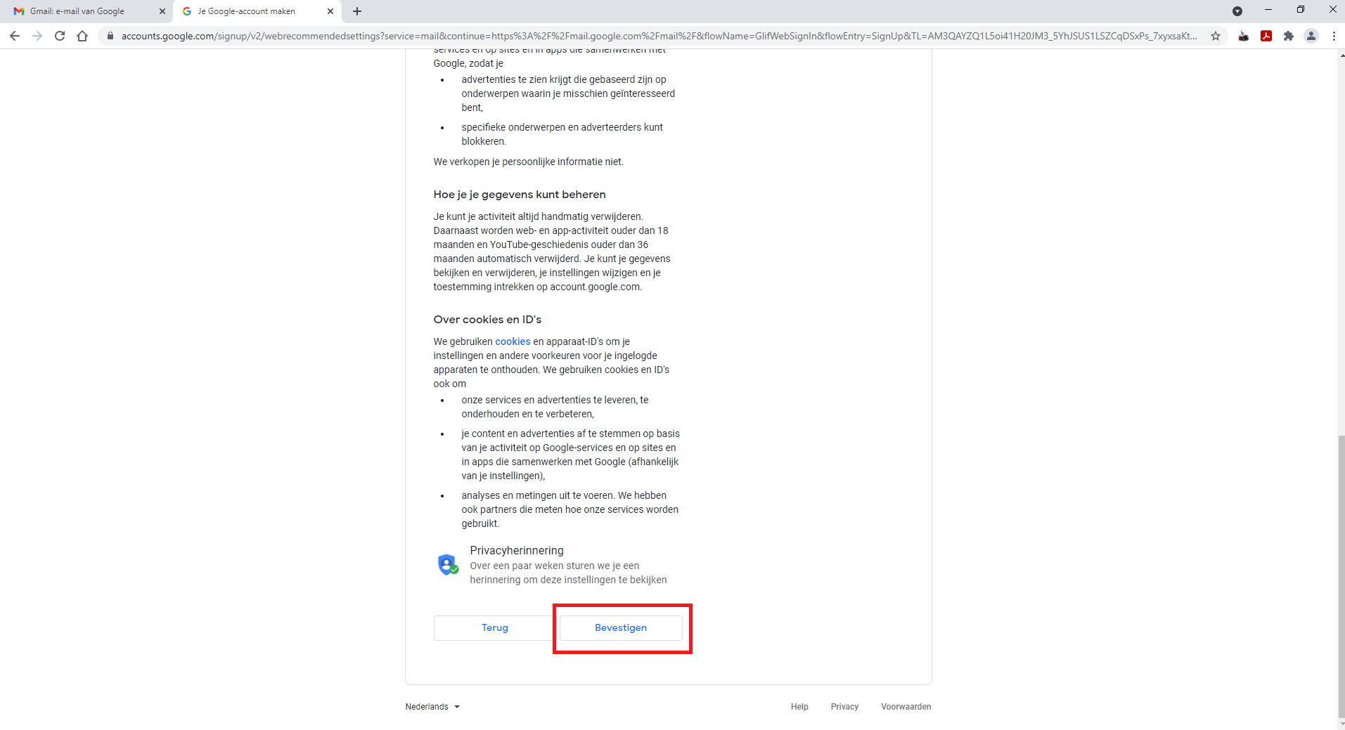 - Stap 4: Neem uw accountinstellingen door, klik onderaan de webpagina op 'Bevestigen' en u kan aan de slag in Gmail.