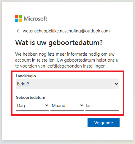 - Stap 2: Vul onder Account maken uw nieuwe gewenste Outlook e-mailadres in en bevestig met 'Volgende'.