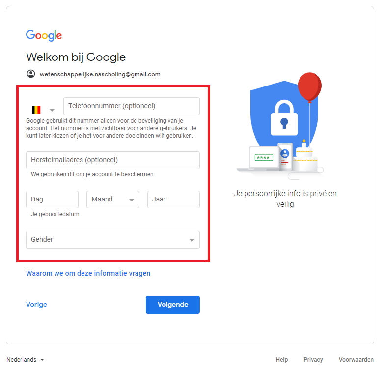 - Stap 2: Vul uw persoonlijke gegevens is, kies een geschikt e-mailadres en leg een veilig wachtwoord vast. Bevestig iedere stap met 'Volgende'.