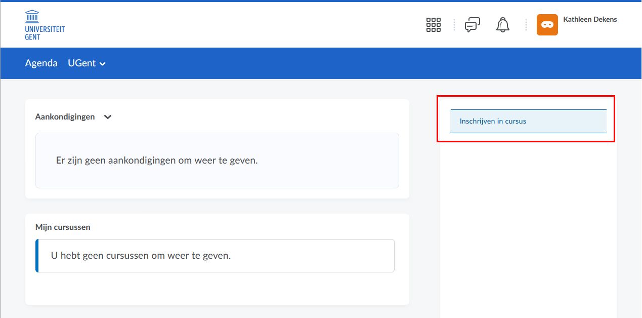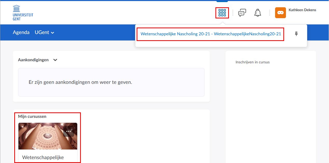 Vanaf nu aan staat de cursus in uw cursuslijst die u via, zowel het menu bovenaan, als de "Mijn cursussen" widget lager op de pagina kan bereiken. (afbeelding “Ingeschreven”).