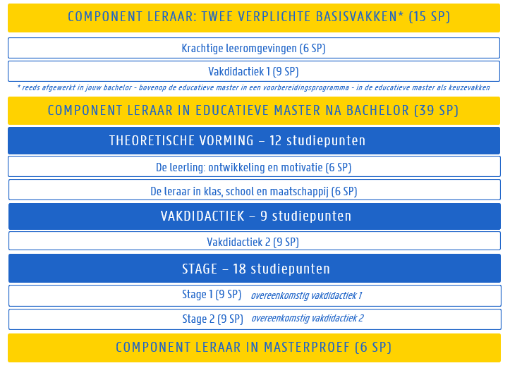 - 15 studiepunten verplichte basisvakken (reeds afgewerkt in jouw bachelor - bovenop de educatieve master in een voorbereidingsprogramma - in de educatieve master als keuzevakken in de component domein)