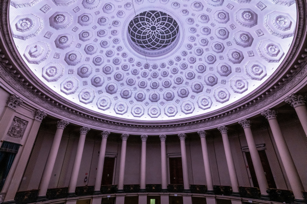 Binnen kom je eerst langs een immense ontvangsthal: het peristilium. Op de zwart-witgeblokte vloer loopt een koperen meridiaanlijn van 21 meter lang. Door een oculus, een ronde opening in het plafond, wordt een bundel zonlicht op de vloer geprojecteerd.