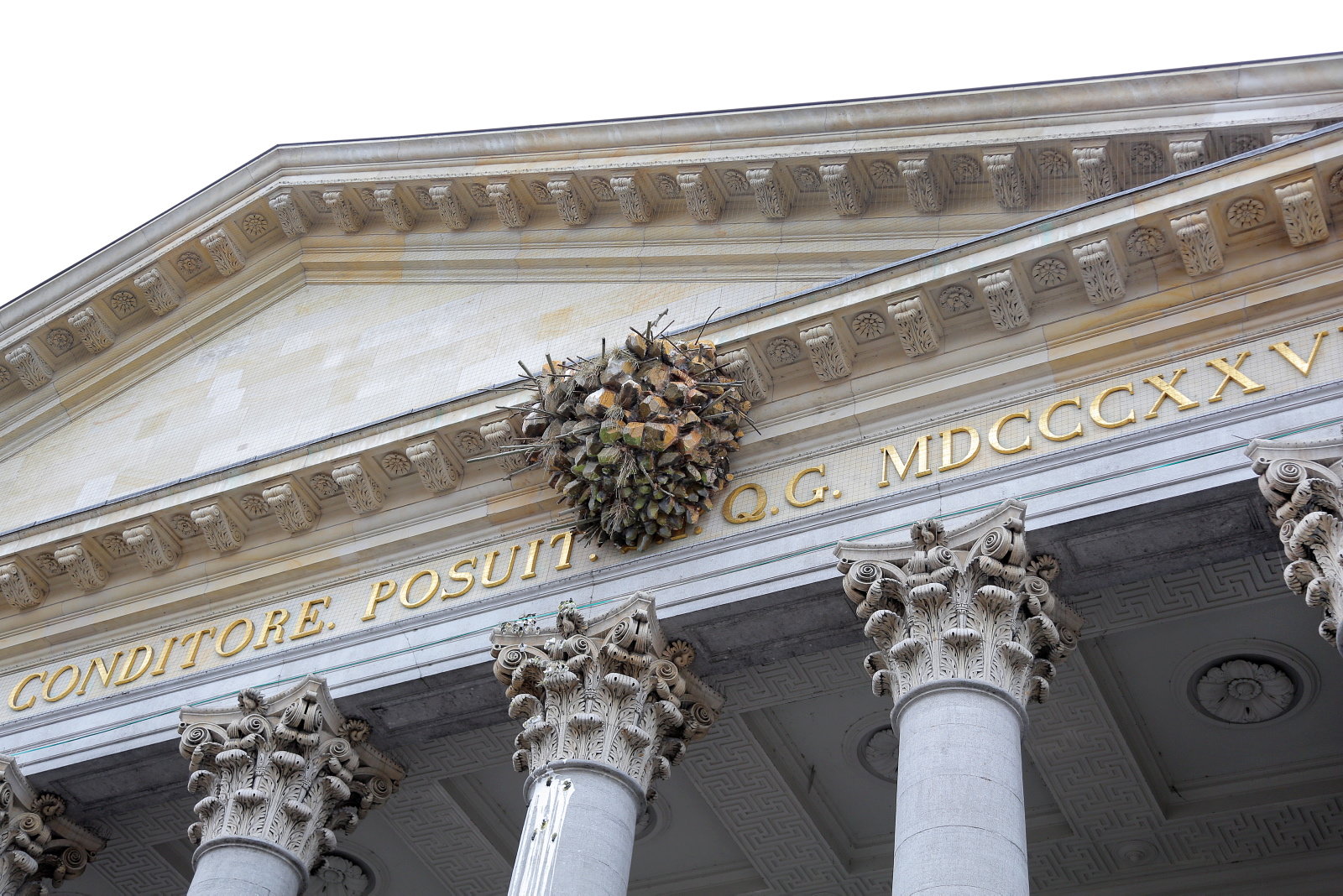 Jan Fabre pakt de zuilen van de Aula in met 600 kg ham zodat ze op marmer lijken tijdens de openluchttentoonstelling Over the Edges.