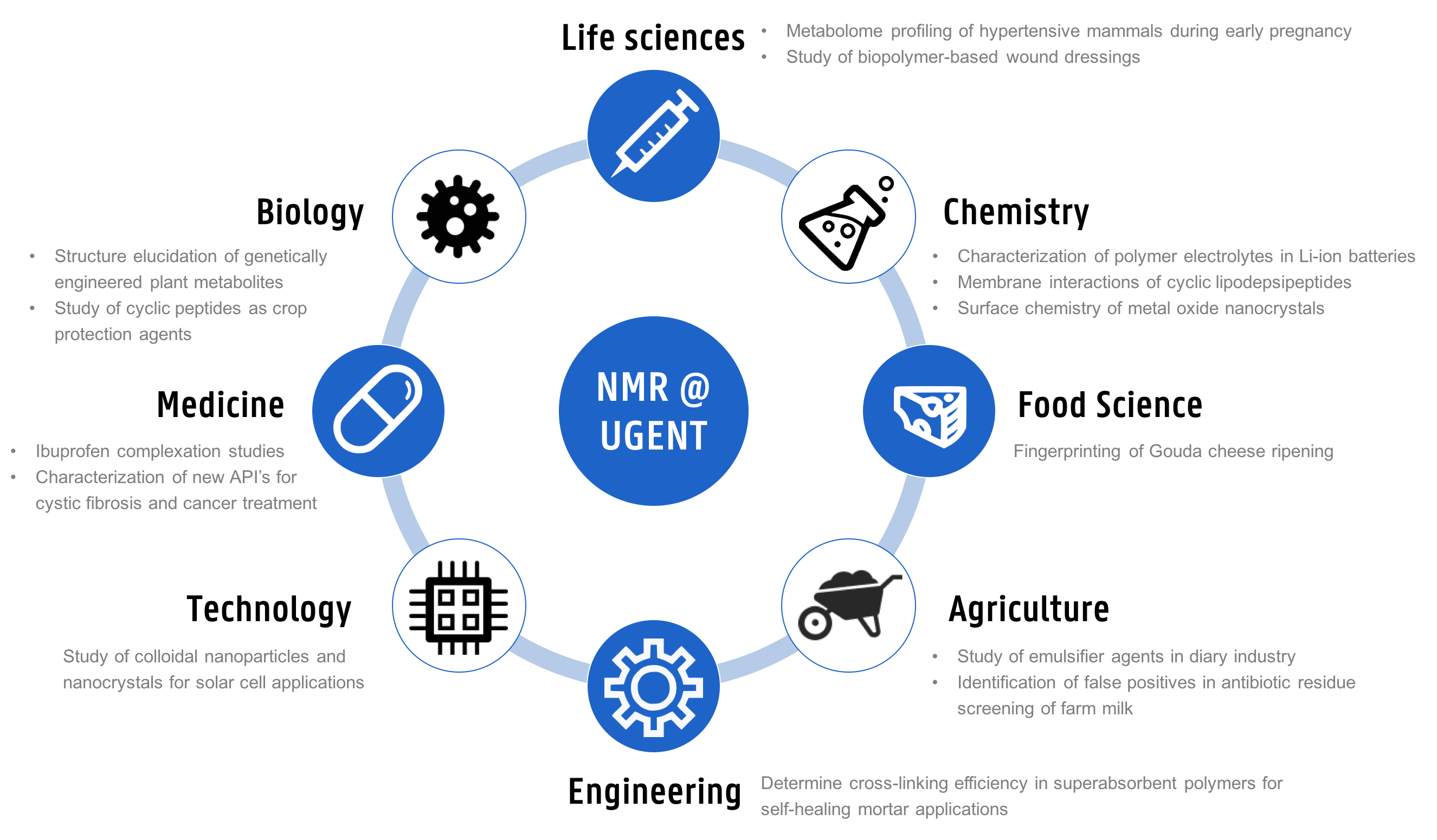 The goal of the NMR Expertise Centre is to make the NMR infrastructure and knowledge accessible to the entire UGent Research Community and beyond. The figure below provides a number of research areas and specific studies were NMR has played a central role in providing crucial information. The areas highlighted here are non exhaustive and include only a few examples.
