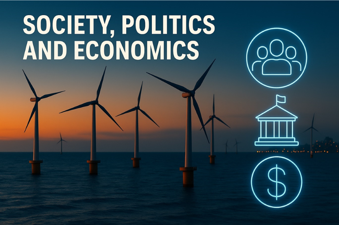 This domain of expertise addresses the societal, legal, economic, and geopolitical aspects of offshore wind energy development.