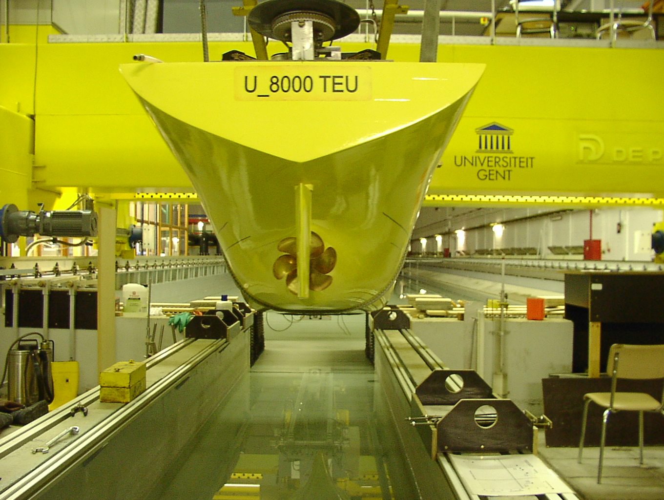 Established in 1992–93, the towing tank for manoeuvres in confined water is located in Antwerp and focuses on the hydrodynamic behaviour of vessels in restricted navigation areas, such as harbours and canals. It supports both captive and free-running tests. The dimensions are: total length of 88.0 m, effective length of 67.0 m, width of 7.0 m and maximum water depth of 0.5 m. The tank features a main longitudinal carriage (max speed: 2.0 m/s), lateral carriage (±2.55 m range), and a yawing table (rotation: -130° to +220°). This facility is equipped with a piston-type wave maker capable of generating both regular and irregular waves and includes force dynamometers, propeller thrust and torque measurement devices, rudder force and angle sensors, and wave height measurement tools.