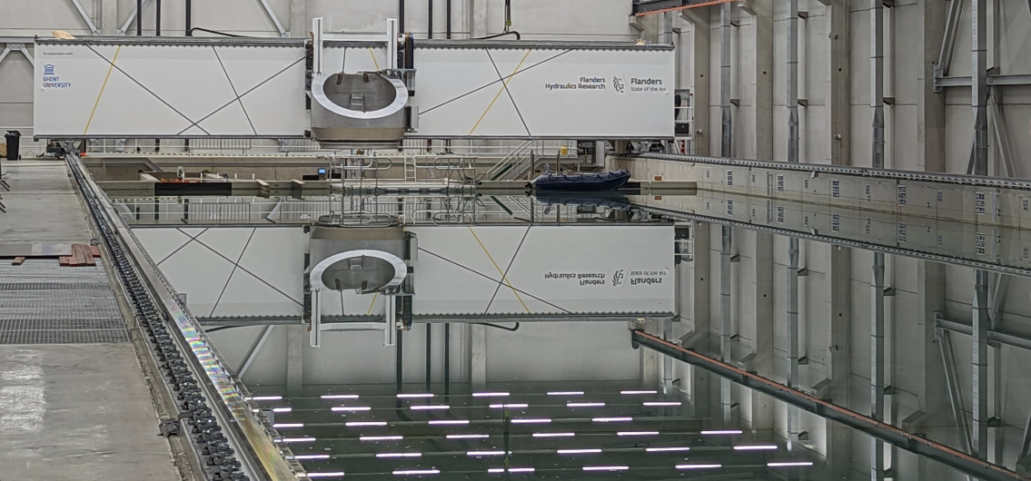 Furthermore, a towing tank for manoeuvres in shallow water was inaugurated in May 2019 in Ostend as part of the Flanders Maritime Laboratory. This facility addresses the challenges of ship behaviour in very shallow waters. It is designed for high-precision testing and supports autonomous and remote-controlled vessel studies. The dimensions are: total length of 174.0 m; effective length of 134.0 m, width of 20.0 m, maximum water depth of 1.0 m. It is a fully automated system allowing 24/7 testing, with a longitudinal carriage (max speed: 3.0 m/s), lateral carriage (19.5 m range), vertical movement (1.8 m range), and yaw capabilities (±365°).Studies on the impact of shallow water on ship propulsion and steering. A state-of-the-art free-running system was recently installed enabling real-time tracking and control of ship models, facilitating advanced research in autonomous vessel navigation. Furthermore, high-precision instrumentation and control systems are integrated to enhance the accuracy and reliability of test results.