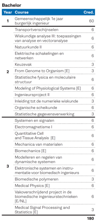 Naast generieke ingenieursvakken starten we vanaf de 2e bachelor met basisvakken in de levenswetenschappen, met het vak van "Genoom tot organisme" in het 3e semester, "Modellering van Fysiologische Systemen" in het 4e semester en "Kwantitatieve analyse van cellen en weefsels" in semester 5. Ingenieursvakken worden progressief meer toegepast op het menselijk lichaam en in de biomedische ingenieursdiscipline met vakken zoals Biomechanica, Biopolymeren, Medische Fysica, Elektronische systemen en instrumentatie voor biomedisch ingenieurs of Medische signaalverwerking en statistiek. Ingenieursproject 2 en het vakoverschrijdend project worden vanzelfsprekend ook biomedisch ingevuld.