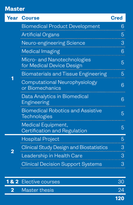 De plichtvakken zijn een mix van ingenieurs-technische en interdisciplinaire vakken in zowel gevestigde domeinen van de biomedische ingenieurswetenschappen als in opkomende domeinen zoals de neuro-ingenieurswetenschappen, robotica of data-analyse en kunstmatige intelligentie ter ondersteuning van het medisch beslissingsproces.