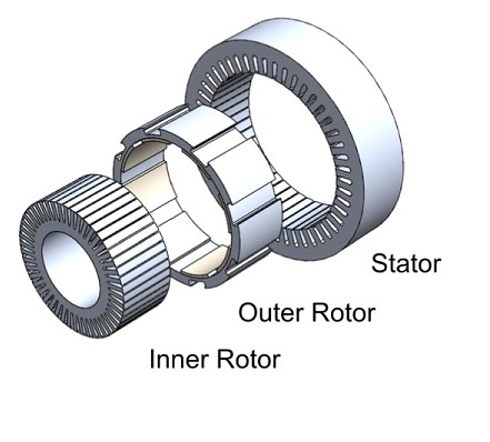 A typical application is in the drive train of a vehicle. In that case mechanically one of the shafts is connected to the internal combustion engine (ICE), the second shaft to the final drive of the vehicle. Electrically both the stator and the inner rotor are connected to a common dc-bus using two power electronic converters (PEC’s). Optionally a battery can be added. The main functionality of the EVT is to work as power split transmission. The power to the wheels is split in a part coming from the ICE, while the remaining part is exchanged with a battery. A drive train with EVT is thus a hybrid drive train. When the battery is omitted, the EVT can work as a “simple” continuously variable transmission (CVT).