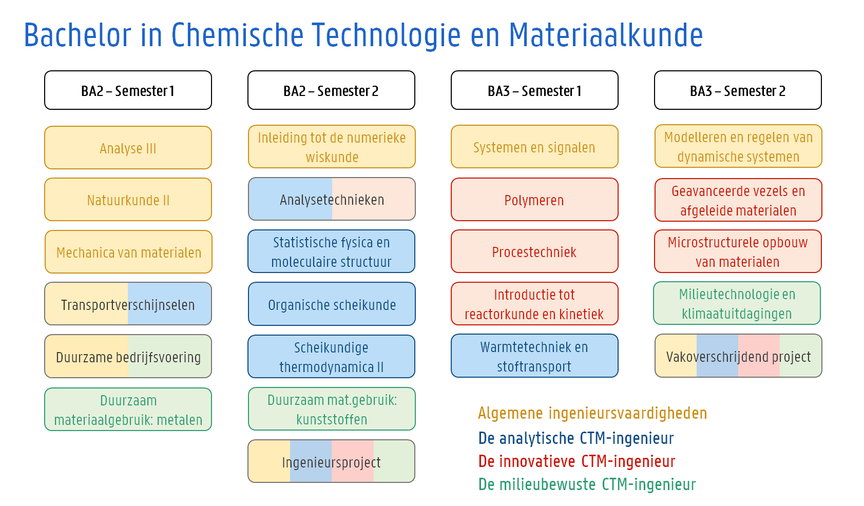 De bacheloropleiding Chemische Technologie en Materiaalkunde kadert binnen de algemene opleiding Bachelor of Science in de ingenieurswetenschappen. Het eerste semester start met een verdere fundamentele vorming in wiskunde en natuurkunde, alsook met algemene ingenieursdisciplines als transportverschijnselen en mechanica (de algemene ingenieursleerlijn). Eveneens maak je al een eerste keer kennis met de duurzaamheidsleerlijn binnen de opleiding en dit zowel op economisch als op CTM vlak!