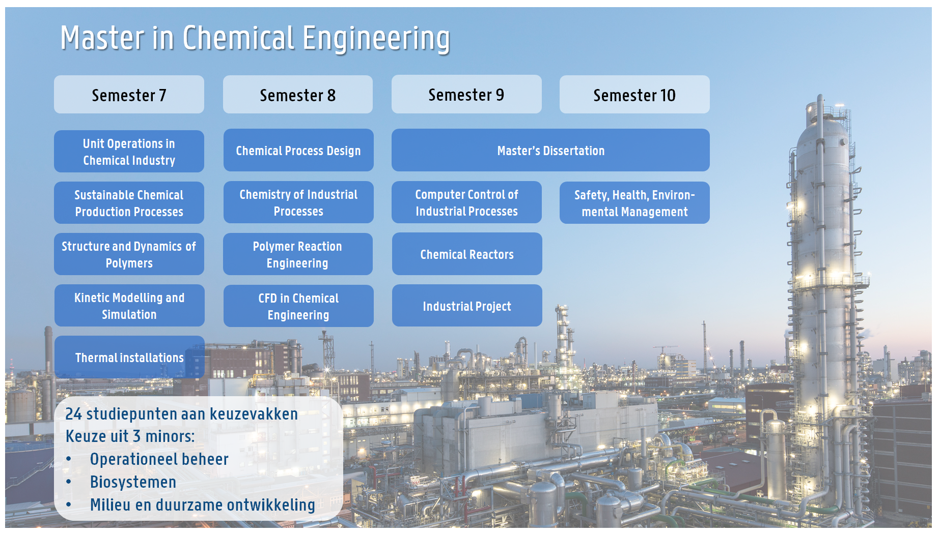 Hoe kan CO2 uit de lucht gefilterd worden en verwerkt worden tot een nieuw product? Op welke manier kunnen we plasticafval gebruiken in plaats van olie om nieuwe producten te maken? Wordt waterstof de belangrijkste schakel in onze energievoorziening? Als deze vragen jou interesseren, dan is de Master of Science in Chemical Engineering iets voor jou. In deze opleiding ga je de uitdaging aan om de chemische industrie milieuvriendelijk, veilig en rendabel te maken en te houden. De chemische ingenieur kijkt hiervoor zowel naar de fenomenen op atomair en moleculair niveau als naar wat er op het niveau van de chemische fabriek gebeurt. Gedurende deze master kom je in aanraking met experts uit de chemische industrie maar ontdek je ook het nieuwste onderzoek. Dit zorgt ervoor dat je perfect voorbereid bent voor het bedrijfsleven maar dat je ook de wetenschappelijke voorbereiding hebt om enkele jaren wetenschappelijk onderzoek te verrichten tijdens een doctoraat. Kortom, deze opleiding vormt je tot een expert in het ontwerpen en verduurzamen van industriële processen en producten, met chemie als speerpunt.