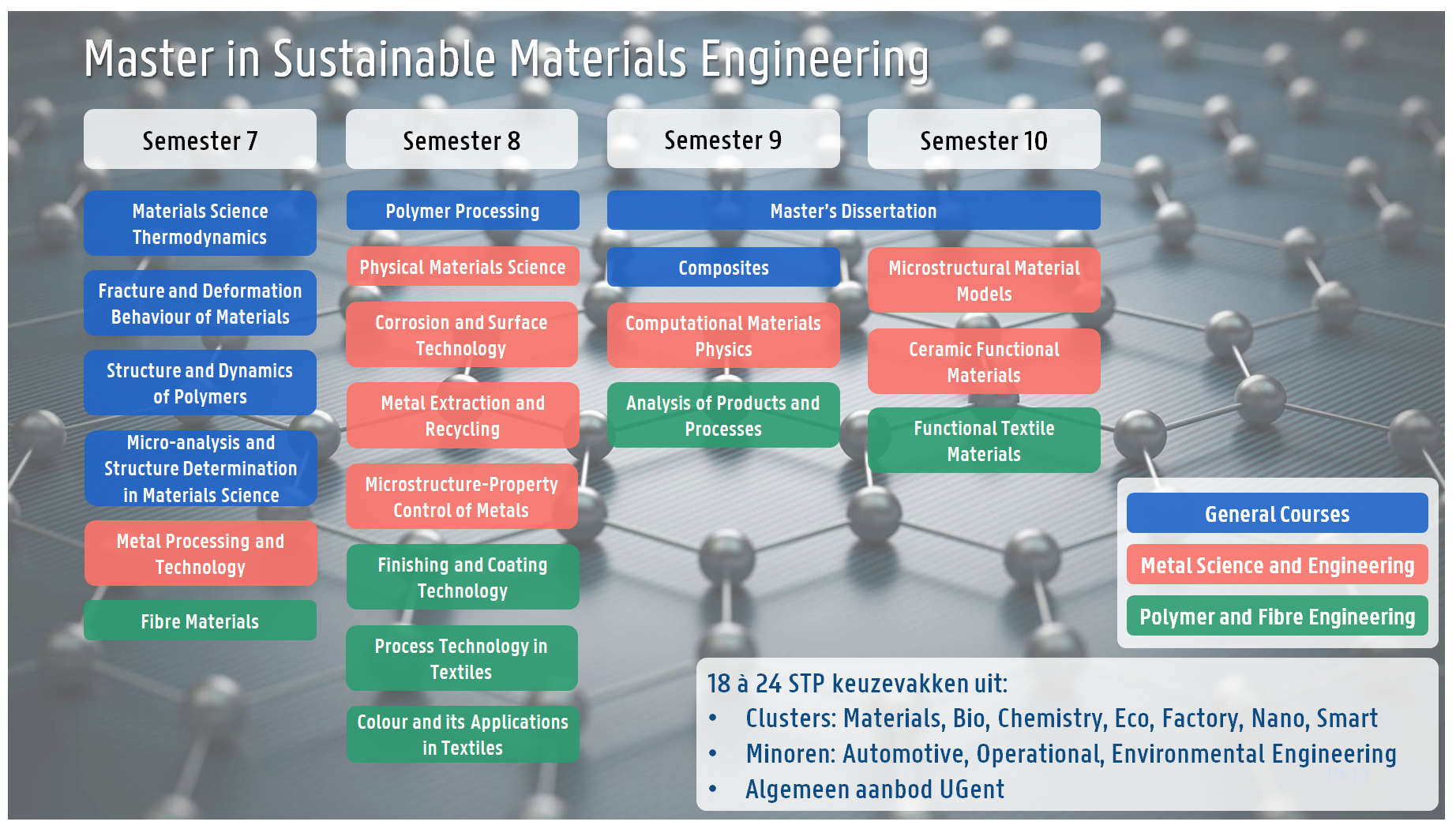 “Choose the right tool for the right job” is een algemene wijsheid voor elke ingenieur. Maar welke tool moet je dan juist nemen? Hoe kan je deze tool zelf aanpassen zodat je jouw toepassing kan verbeteren? En welke materialen en processen ga je hiervoor nodig hebben? Dit leer je allemaal in de master Sustainable Materials Engineering. In deze opleiding focus je op een combinatie van de chemische samenstelling, het productieproces en de nabehandelingen om de eigenschappen van materialen te verbeteren, of zelfs om nieuwe materialen te maken. Deze complexe interacties ga je praktisch ondervinden via zowel labo- als modelleerwerk, als ook bestuderen in de hoorcolleges gegeven door experts in het veld. Tenslotte is er ook een sterke focus op duurzaam materiaaldesign, lichtgewicht materialen zoals composieten, en de grondstoffenproblematiek. De master is opgebouwd uit een gemeenschappelijk stam waar je essentiële competenties verwerft voor elke materiaalkundige ingenieur en een specifieke major die focust op een welbepaalde materiaalklasse. In de gemeenschappelijk stam zal je bijvoorbeeld dieper ingaan op de thermodynamica en analysetechnieken specifiek voor materialen, maar eveneens kijken naar het breukgedrag van materialen. Binnen de major Metals Science and Engineering is er een grote focus op lichte, sterke en innovatieve metalen alsook hoe deze metalen via coatings of legeringselementen resistenter tegen corrosie te maken. Ook de productieprocessen van primaire ertsen als secundaire bronnen zoals scrap of e-waste worden behandeld. De major Polymer and Fibre Engineering legt dan weer de nadruk op het gebruik van polymeren en vezelstructuren voor allerhande toepassingen gaande van typische onderdelen uit kunststoffen, tot verpakkingsmaterialen, textiel en composietmaterialen. Hierbij komt de gehele productieketen, gaande van grondstof tot eindproduct aan bod, alsook de mogelijkheden om als ingenieur nieuwe, duurzamere en betere eindproducten te ontwerpen.