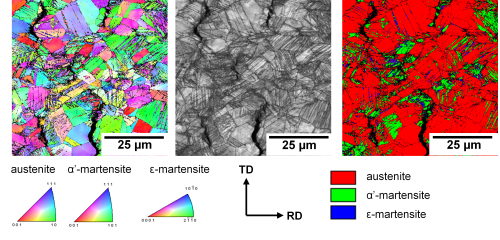 Analysis of fracture surfaces and side surfaces to reveal the deformation and failure mechanisms in the presence of hydrogen belongs to the main expertise of the SMS group. Some examples are given below. The first figure represents SE images of fracture surfaces of a martensitic steel tested through bending with hydrogen revealing different fracture types. The second figure illustrates an EBSD analysis of the deformation mechanisms in austenitic steel in the presence of hydrogen. Research into the initiation and propagation of hydrogen-induced and hydrogen-assisted cracks to determine microstructurally vulnerable features can be performed as well. The reader is referred to material characterization and failure analysis for more information on the available characterization techniques.