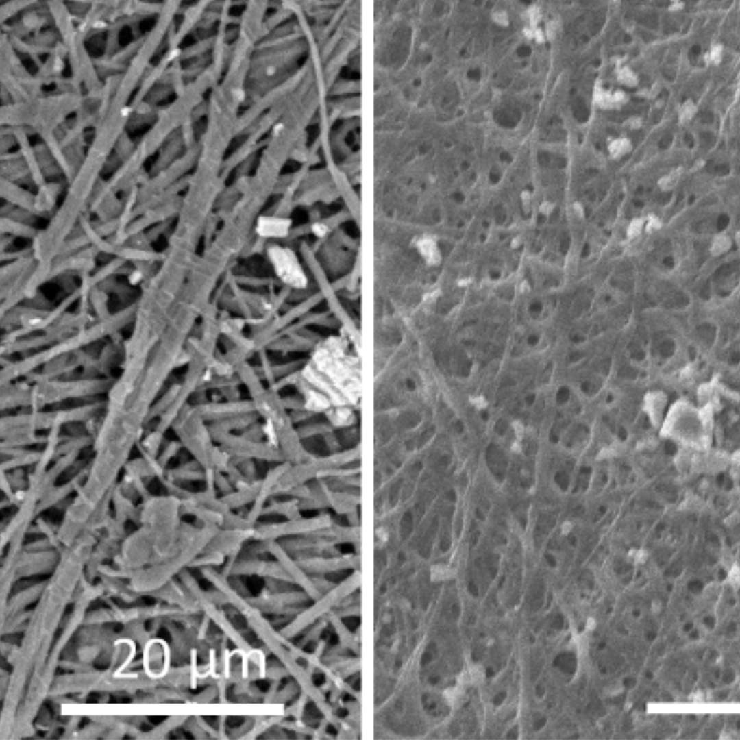 Fibers, and the polymers they’re made of, are the building blocks of all textile materials. Therefor at CTSE we focus on developing new polymers, modifying existing polymers and create new types of fibers and fiber structures. Approaching this research from a ‘molecule to filament’ viewpoint offers many possibilities to tune the final materials to the demands of the applications in terms of energy-use, mechanical performance, unique properties and so on. One key research area is that of electrospinning of nanofibers and nanofibrous membranes. They can be thought of as a novel class of materials consisting of very thin fibres with typical diameters below 500 nm. As a comparison, classical “textile” fibres have diameters between 50 and 200 µm. The small diameter gives nanofibrous membranes interesting characteristics such as a large surface area, a high porosity (> 90%) and improved mechanical properties compared to the bulk polymer. These materials possess a lot of potential for a broad field of applications such as in wound dressings, advanced composites, filter technology, batteries, sensors and much more. A glossary of some of our current research topics is given below.