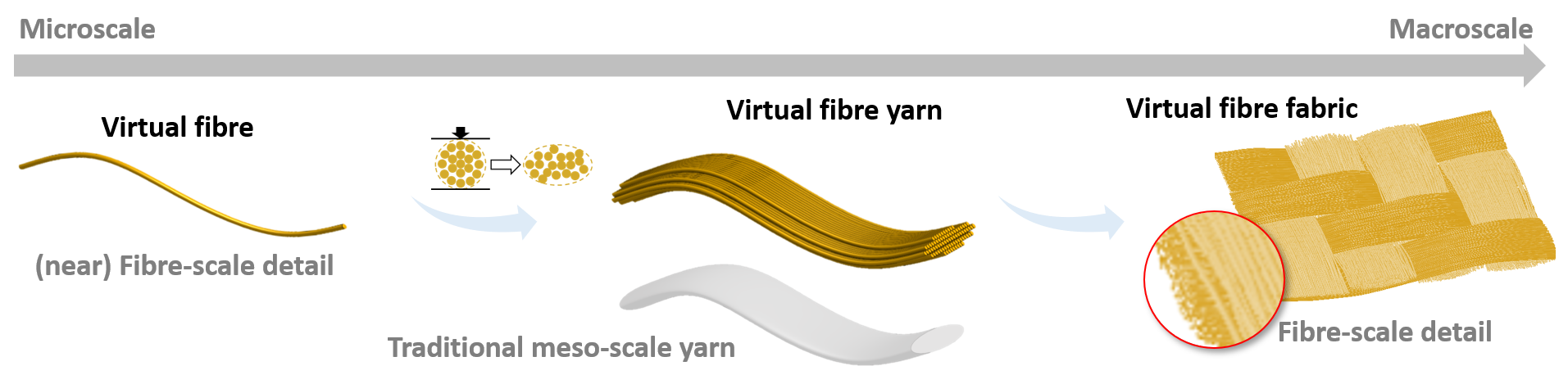 The modelling approach is based on the so-called Virtual Fibre (VF) method (also called Digital Element method). The core idea is to still model fibres explicitly, but not all of them. A yarn or a fabric is represented by a collection of a more limited number of virtual fibres. For example, instead of a 3K yarn with 3000 filaments, 50-60 virtual fibres are modelled that mimic more or less correctly all deformation modes of the real yarn. The modelling framework is physics-based and the yarn and fabric models are calibrated by information from the yarn datasheets and well-known properties of the fabric (number of warp/weft yarns per centimetre, crimp angle, areal weight, etc.).